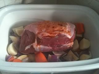 Today is a very simple one, Beef Pot Roast. Easy as! Peel and cut into reasonable pieces 4 large potatoes (I had 8 small), 2 good size carrots and 2 onions (i used red cos i like them as explained yesterday). Place them in the bottom of your slow cooker. Place a good size piece of Beef Blade Roast on top of the veges, mix 1 cube (or sachet) of beef stock in 125ml boiling water, pour over and around, put lid on, walk away for 10-12 hours if you are cooking on low, or 5-6 on high (perfect if you have to go to work, you can leave it on all day while you are at work, come home and dinner is ready!). I made my life easier by peeling and chopping the veges last night and put them in a bowl of water in the fridge (stops them going brown) which gave me the added advantage of a little vege stock to put in, substituting part of the boiling water the recipe asked for with the stock.